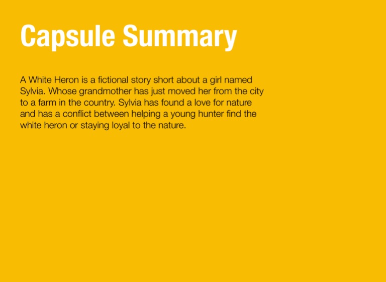 A White Heron is a fictional story short about a girl named Sylvia. Whose grandmother has just moved her from the city to a farm in the country. Sylvia has found a love for nature and has a conflict between helping a young hunter find the white heron or staying loyal to the nature.
