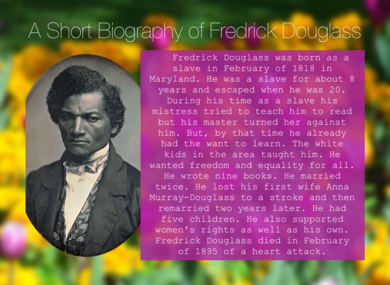 Fredrick Douglass was born as a slave in February of 1818 in Maryland. He was a slave for about 8 years and escaped when he was 20. During his time as a slave his mistress tried to teach him to read but his master turned her against him. But, by that time he already had the want to learn. The white kids in the area taught him. He wanted freedom and equality for all. He wrote nine books. He married twice. He lost his first wife Anna Murray-Douglass to a stroke and then remarried two years later. He had five children. He also supported women's rights as well as his own. Fredrick Douglass died in February of 1895 of a heart attack.