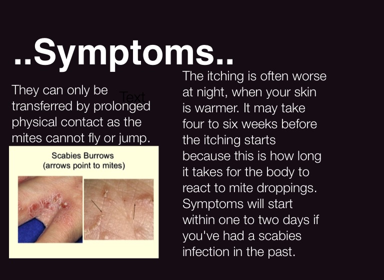 The itching is often worse at night, when your skin is warmer. It may take four to six weeks before the itching starts because this is how long it takes for the body to react to mite droppings.