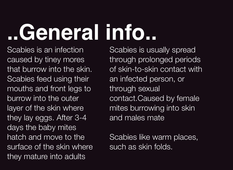Scabies is usually spread through prolonged periods of skin-to-skin contact with an infected person, or through sexual contact.Caused by female mites burrowing into skin and males mate