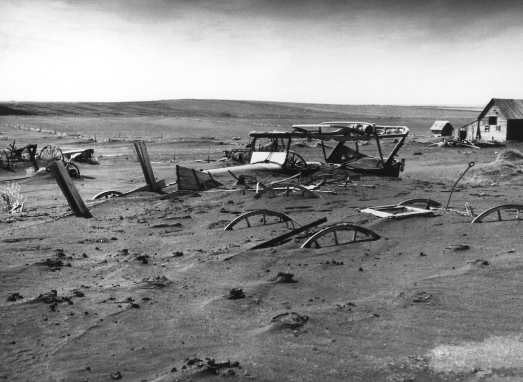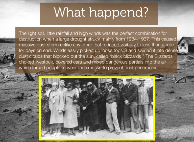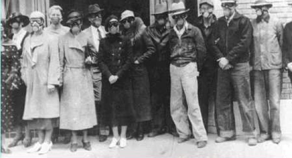 The light soil, little rainfall and high winds was the perfect combination for destruction when a large drought struck mainly from 1934-1937. This caused massive dust storm unlike any other that reduced visibility to less than a mile for days on end. Winds easily picked up loose topsoil and swirled it into dense dust clouds that blocked out the sun, called “black blizzards.” The Blizzards choked livestock, covered cars and mixed dangerous partials into the air which forced people to wear face masks to prevent dust phnemonia.