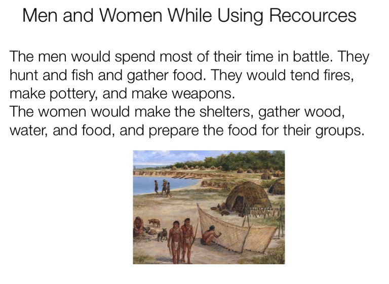 The men would spend most of their time in battle. They hunt and fish and gather food. They would tend fires, make pottery, and make weapons.