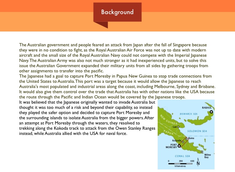 It was believed that the Japanese originally wanted to invade Australia but thought it was too much of a risk and beyond their capability, so instead they played the safer option and decided to capture Port Moresby and the surrounding islands to isolate Australia from the bigger powers. After an attempt at Port Moresby through the waters, they resolved to trekking along the Kokoda track to attack from the Owen Stanley Ranges instead, while Australia allied with the USA for naval force.