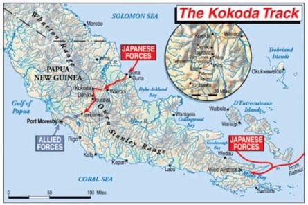 In July1942 the Japanese first landed around the Buna area on the north-east coast of Papua. The Kokoda track is a jungle pathway over mountains that could only be traveled on foot, meaning all supplies and equipment had to be transported with the troops as they trekked. The Japanese were slowing pushing the Australian troops backwards, towards Port Moresby. This is because the conditions in the jungle caused diseases, like malaria, and resources were running low for the Australians, so they couldn't fight to the best of their ability. The wounded had to be stretchered to safety, but many had to walk because there were only a limited amount of stretchers. Luckily the indigenous Papuan people offered to care for the wounded Australian troops, who named them "fuzzy-wuzzy angels".