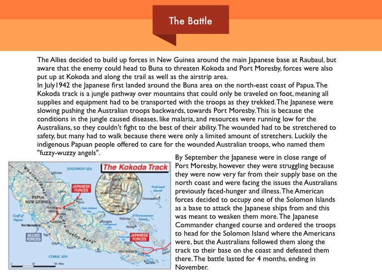 By September the Japanese were in close range of Port Moresby, however they were struggling because they were now very far from their supply base on the north coast and were facing the issues the Australians previously faced-hunger and illness. The American forces decided to occupy one of the Solomon Islands as a base to attack the Japanese ships from and this was meant to weaken them more. The Japanese Commander changed course and ordered the troops to head for the Solomon Island where the Americans were, but the Australians followed them along the track to their base on the coast and defeated them there. The battle lasted for 4 months, ending in November.