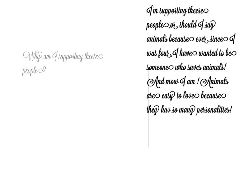 I'm supporting theese people,or should I say animals because ever since I was four,I have wanted to be someone who saves animals! And mow I am ! Animals are easy to love because they hav so many personalities!