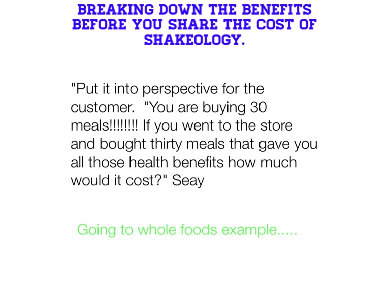 "Put it into perspective for the customer. "You are buying 30 meals!!!!!!!! If you went to the store and bought thirty meals that gave you all those health benefits how much would it cost?" Seay