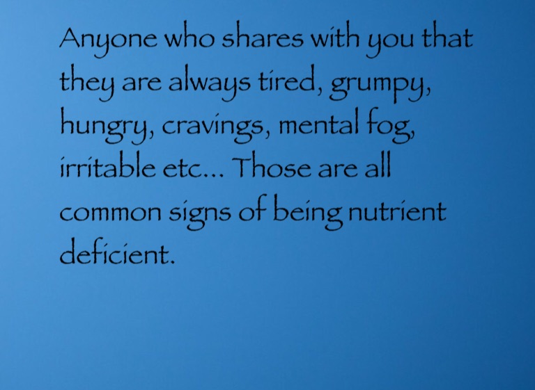 Anyone who shares with you that they are always tired, grumpy, hungry, cravings, mental fog, irritable etc... Those are all common signs of being nutrient deficient.