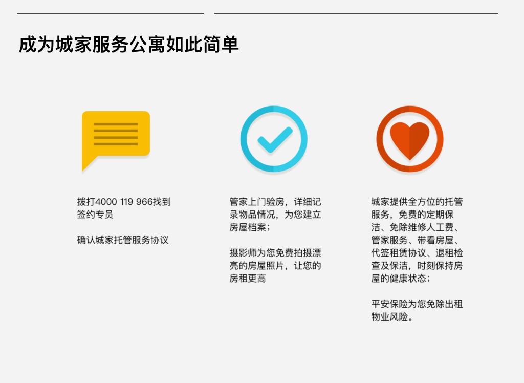 城家提供全方位的托管服务,免费的定期保洁、免除维修人工费、管家服务、带看房屋、代签租赁协议、退租检查及保洁,时刻保持房屋的健康状态;