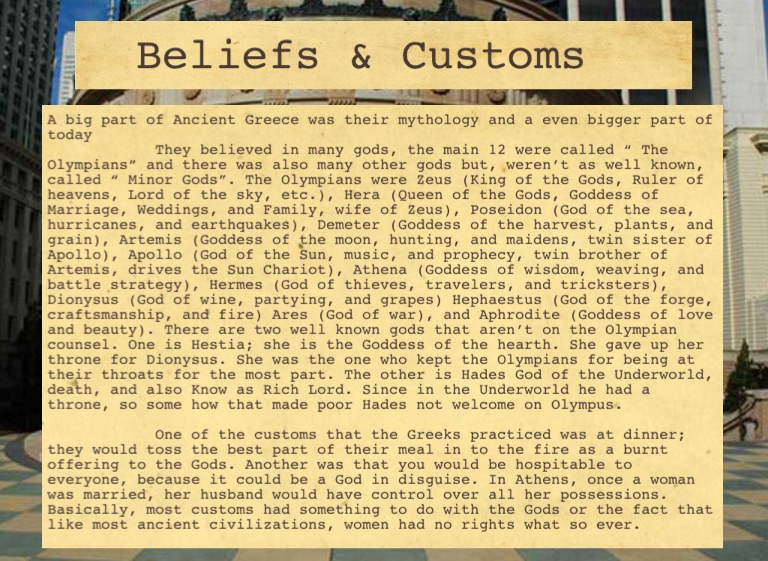 One of the customs that the Greeks practiced was at dinner; they would toss the best part of their meal in to the fire as a burnt offering to the Gods. Another was that you would be hospitable to everyone, because it could be a God in disguise. In Athens, once a woman was married, her husband would have control over all her possessions. Basically, most customs had something to do with the Gods or the fact that like most ancient civilizations, women had no rights what so ever.