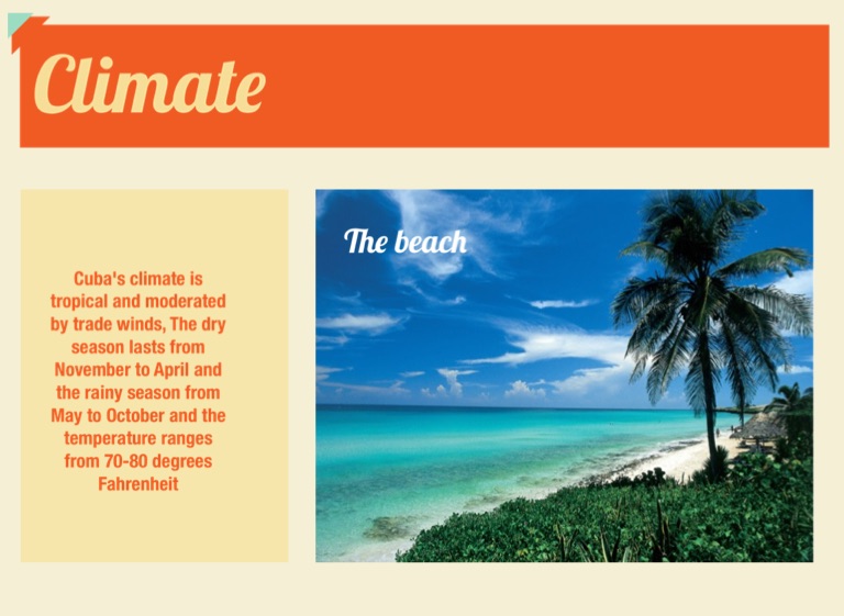 Cuba's climate is tropical and moderated by trade winds, The dry season lasts from November to April and the rainy season from May to October and the temperature ranges from 70-80 degrees Fahrenheit