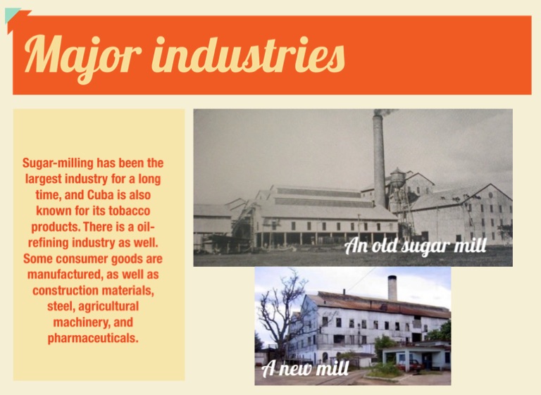 Sugar-milling has been the largest industry for a long time, and Cuba is also known for its tobacco products. There is a oil-refining industry as well. Some consumer goods are manufactured, as well as construction materials, steel, agricultural machinery, and pharmaceuticals.