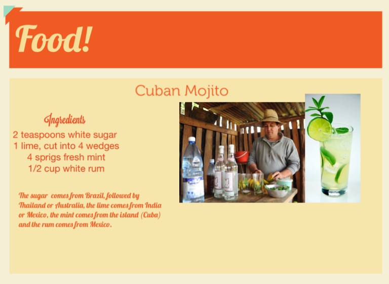 The sugar comes from Brazil, followed by Thailand or Australia, the lime comes from India or Mexico, the mint comes from the island (Cuba) and the rum comes from Mexico.