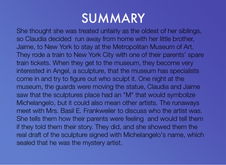 She thought she was treated unfairly as the oldest of her siblings, so Claudia decided run away from home with her little brother, Jaime, to New York to stay at the Metropolitan Museum of Art. They rode a train to New York City with one of their parents' spare train tickets. When they get to the museum, they become very interested in Angel, a sculpture, that the museum has specialists come in and try to figure out who sculpt it. One night at the museum, the guards were moving the statue, Claudia and Jaime saw that the sculptures place had an "M" that would symbolize Michelangelo, but it could also mean other artists. The runaways meet with Mrs. Basil E. Frankweiler to discuss who the artist was. She tells them how their parents were feeling and would tell them if they told them their story. They did, and she showed them the real draft of the sculpture signed with Michelangelo's name, which sealed that he was the mystery artist.