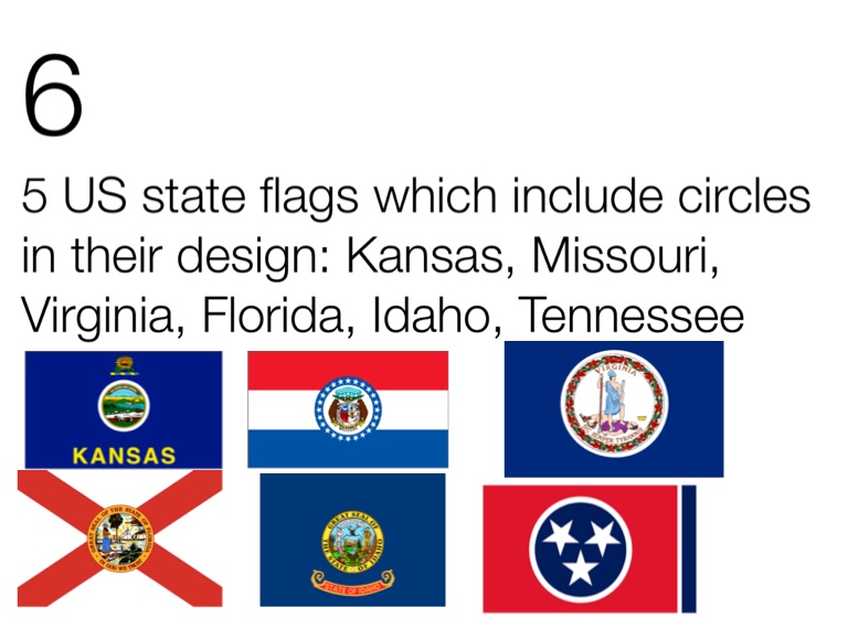 5 US state flags which include circles in their design: Kansas, Missouri, Virginia, Florida, Idaho, Tennessee