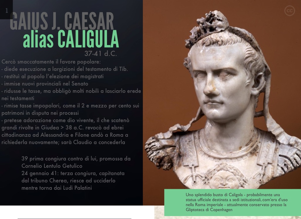 24 gennaio 41: terza congiura, capitanata dal tribuno Cherea, riesce ad ucciderlo mentre torna dai Ludi Palatini
