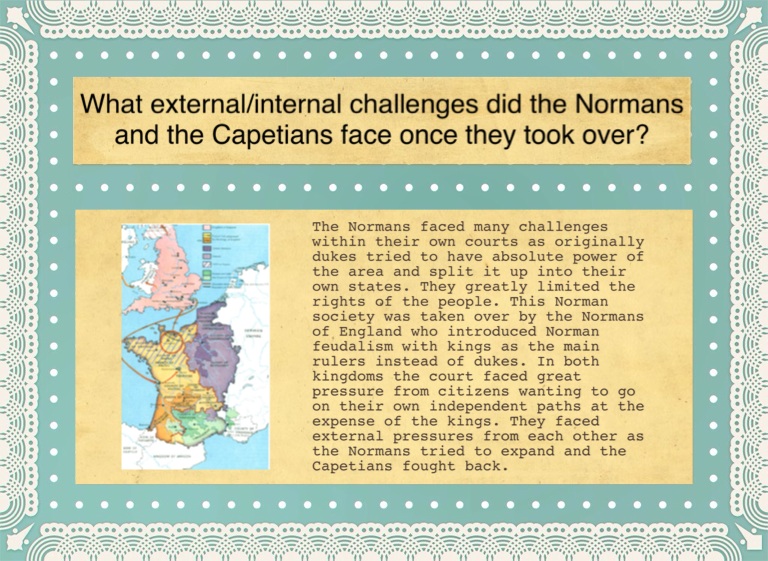 The Normans faced many challenges within their own courts as originally dukes tried to have absolute power of the area and split it up into their own states. They greatly limited the rights of the people. This Norman society was taken over by the Normans of England who introduced Norman feudalism with kings as the main rulers instead of dukes. In both kingdoms the court faced great pressure from citizens wanting to go on their own independent paths at the expense of the kings. They faced external pressures from each other as the Normans tried to expand and the Capetians fought back.