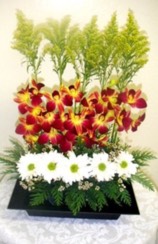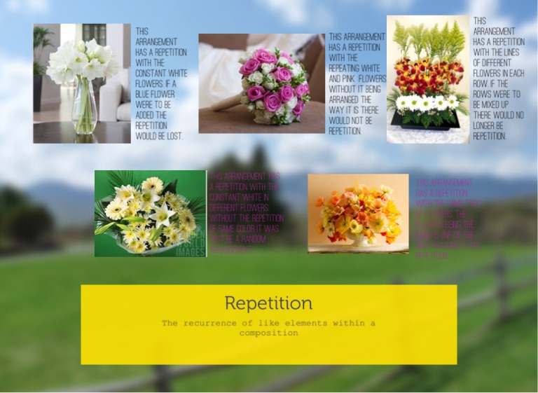 This arrangement has a repetition with the lines of different flowers in each row. If the rows were to be mixed up there would no longer be repetition.