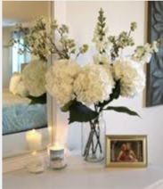 Compared to the night stand the arrangement is in scale. If the flower arrangement were bigger it wouldn't have fit well on the night stand with the candles and picture frame the scale would be lost.