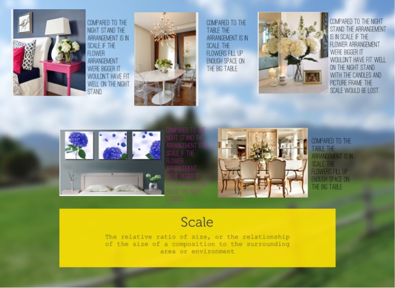 The relative ratio of size, or the relationship of the size of a composition to the surrounding area or environment