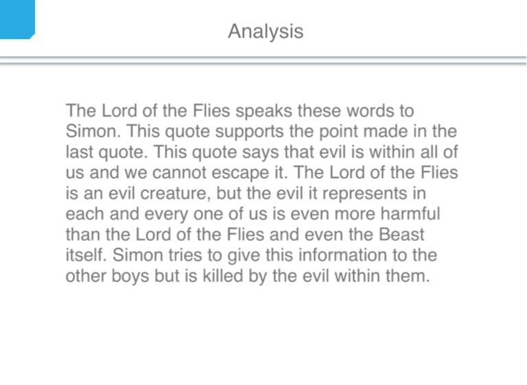 The Lord of the Flies speaks these words to Simon. This quote supports the point made in the last quote. This quote says that evil is within all of us and we cannot escape it. The Lord of the Flies is an evil creature, but the evil it represents in each and every one of us is even more harmful than the Lord of the Flies and even the Beast itself. Simon tries to give this information to the other boys but is killed by the evil within them.