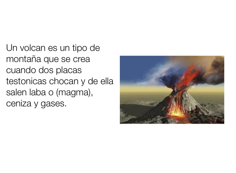 Un volcan es un tipo de montaƱa que se crea cuando dos placas testonicas chocan y de ella salen laba o (magma), ceniza y gases.