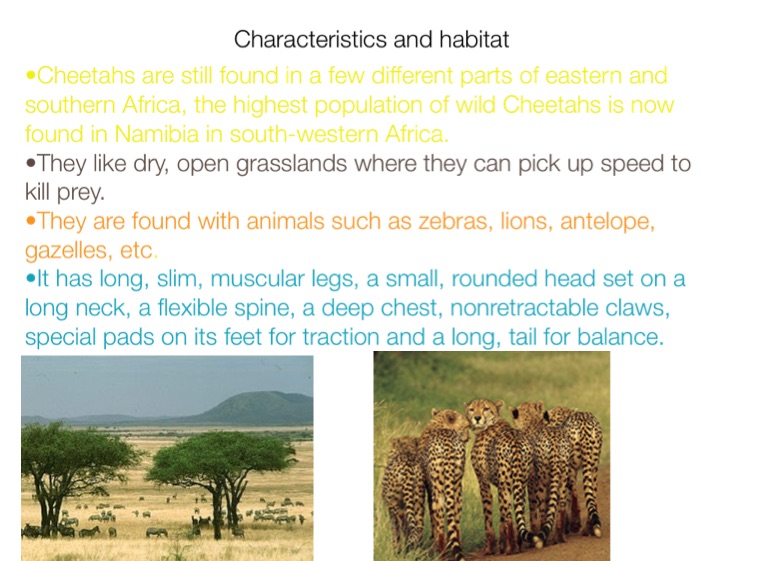 •Cheetahs are still found in a few different parts of eastern and southern Africa, the highest population of wild Cheetahs is now found in Namibia in south-western Africa.