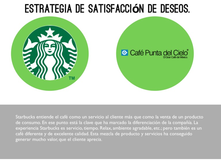 Starbucks entiende el café como un servicio al cliente más que como la venta de un producto de consumo. En ese punto está la clave que ha marcado la diferenciación de la compañía. La experiencia Starbucks es servicio, tiempo. Relax, ambiente agradable, etc.; pero también es un café diferente y de excelente calidad. Esta mezcla de producto y servicios ha conseguido generar mucho valor, que el cliente aprecia.