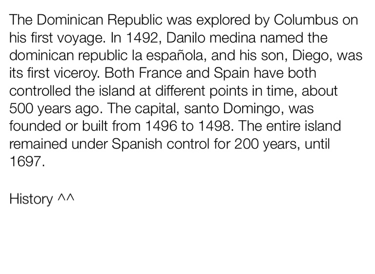 The Dominican Republic was explored by Columbus on his first voyage. In 1492, Danilo medina named the dominican republic la espaƱola, and his son, Diego, was its first viceroy. Both France and Spain have both controlled the island at different points in time, about 500 years ago. The capital, santo Domingo, was founded or built from 1496 to 1498. The entire island remained under Spanish control for 200 years, until 1697.