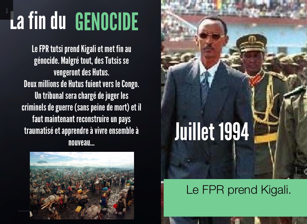 Le FPR tutsi prend Kigali et met fin au génocide. Malgré tout, des Tutsis se vengeront des Hutus.