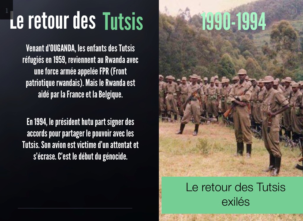 Venant d’OUGANDA, les enfants des Tutsis réfugiés en 1959, reviennent au Rwanda avec une force armée appelée FPR (Front patriotique rwandais). Mais le Rwanda est aidé par la France et la Belgique.