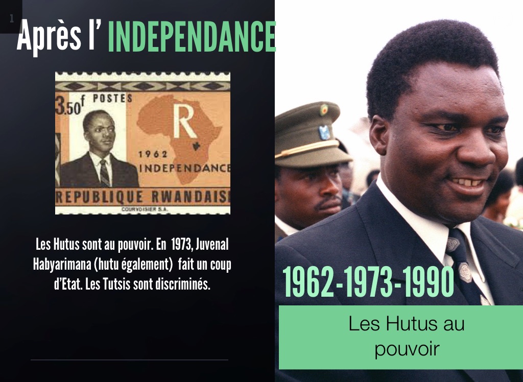Les Hutus sont au pouvoir. En 1973, Juvenal Habyarimana (hutu également) fait un coup d’Etat. Les Tutsis sont discriminés.