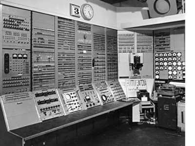 The first computer was very large and had many buttons. The way to control it was with the buttons, and many different people could use it at a time.