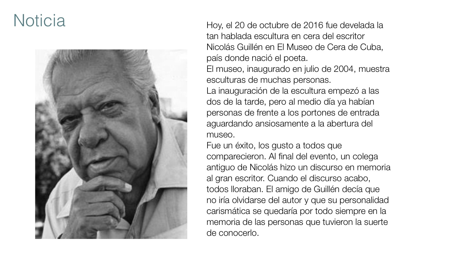 Hoy, el 20 de octubre de 2016 fue develada la tan hablada escultura en cera del escritor Nicolás Guillén en El Museo de Cera de Cuba, país donde nació el poeta.