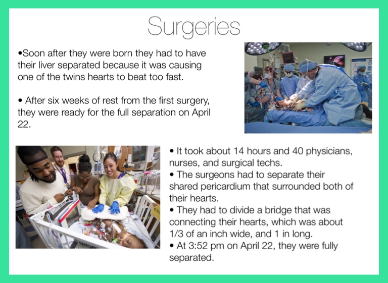 •Soon after they were born they had to have their liver separated because it was causing one of the twins hearts to beat too fast.