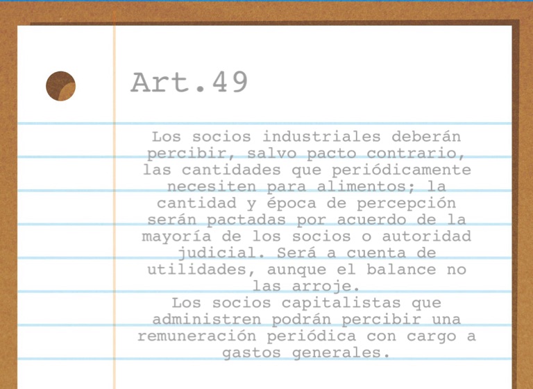 Los socios industriales deberán percibir, salvo pacto contrario, las cantidades que periódicamente necesiten para alimentos; la cantidad y época de percepción serán pactadas por acuerdo de la mayoría de los socios o autoridad judicial. Será a cuenta de utilidades, aunque el balance no las arroje.