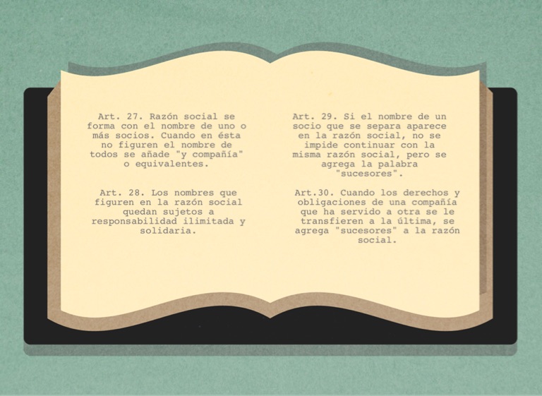 Art. 27. Razón social se forma con el nombre de uno o más socios. Cuando en ésta no figuren el nombre de todos se añade "y compañía" o equivalentes.