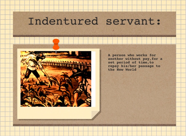 A person who works for another without pay,for a set period of time,to repay his/her passage to the New World