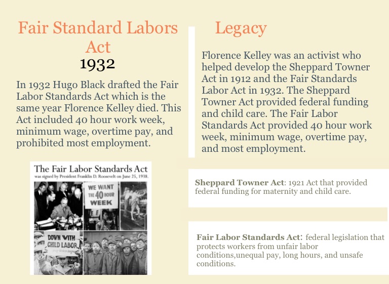 In 1932 Hugo Black drafted the Fair Labor Standards Act which is the same year Florence Kelley died. This Act included 40 hour work week, minimum wage, overtime pay, and prohibited most employment.