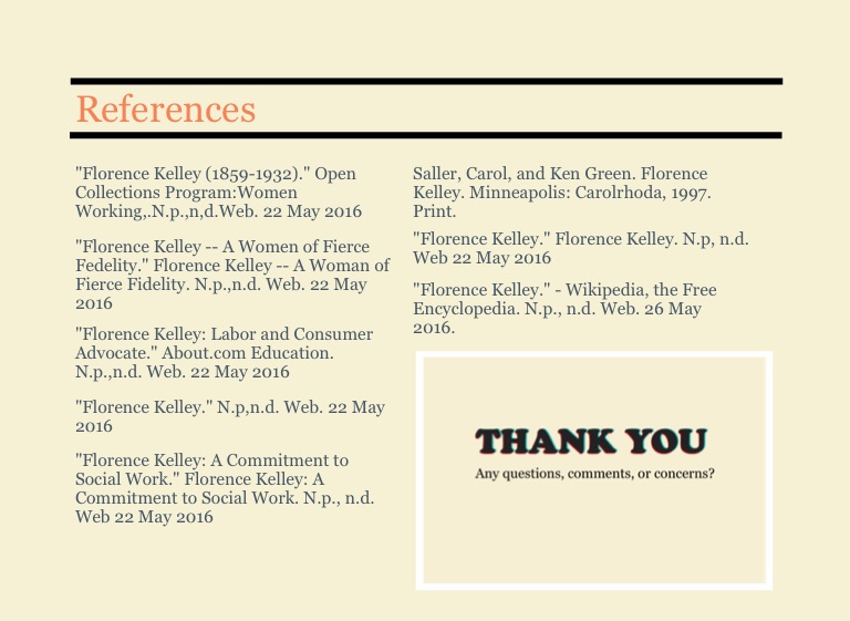 "Florence Kelley -- A Women of Fierce Fedelity." Florence Kelley -- A Woman of Fierce Fidelity. N.p.,n.d. Web. 22 May 2016