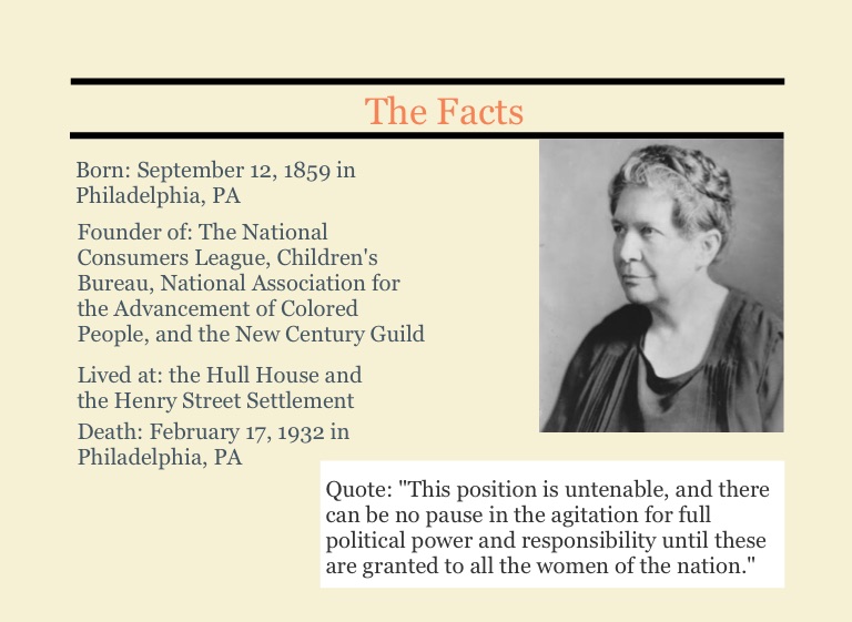 Founder of: The National Consumers League, Children's Bureau, National Association for the Advancement of Colored People, and the New Century Guild