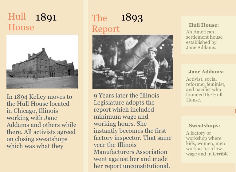 In 1894 Kelley moves to the Hull House located in Chicago, Illinois working with Jane Addams and others while there. All activists agreed on closing sweatshops which was what they fought for.