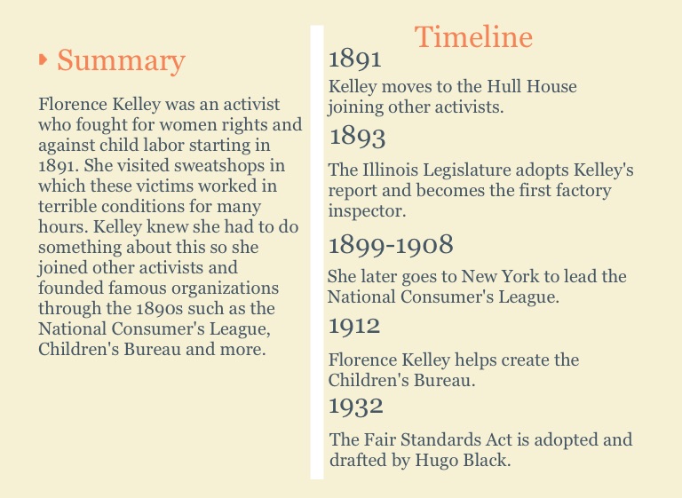 Florence Kelley was an activist who fought for women rights and against child labor starting in 1891. She visited sweatshops in which these victims worked in terrible conditions for many hours. Kelley knew she had to do something about this so she joined other activists and founded famous organizations through the 1890s such as the National Consumer's League, Children's Bureau and more.