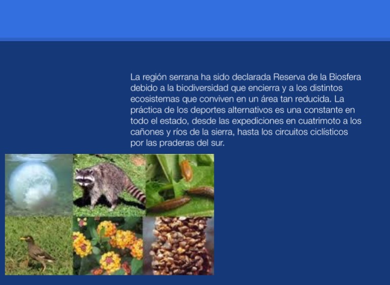 La región serrana ha sido declarada Reserva de la Biosfera debido a la biodiversidad que encierra y a los distintos ecosistemas que conviven en un área tan reducida. La práctica de los deportes alternativos es una constante en todo el estado, desde las expediciones en cuatrimoto a los cañones y ríos de la sierra, hasta los circuitos ciclísticos por las praderas del sur.