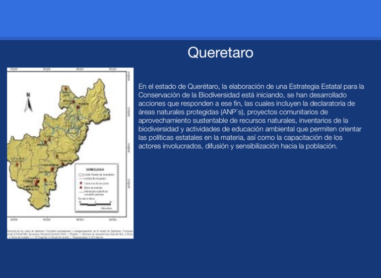 En el estado de Quer茅taro, la elaboraci贸n de una Estrategia Estatal para la Conservaci贸n de la Biodiversidad est谩 iniciando, se han desarrollado acciones que responden a ese fin, las cuales incluyen la declaratoria de 谩reas naturales protegidas (ANP 虂s), proyectos comunitarios de aprovechamiento sustentable de recursos naturales, inventarios de la biodiversidad y actividades de educaci贸n ambiental que permiten orientar las pol铆ticas estatales en la materia, as铆 como la capacitaci贸n de los actores involucrados, difusi贸n y sensibilizaci贸n hacia la poblaci贸n.