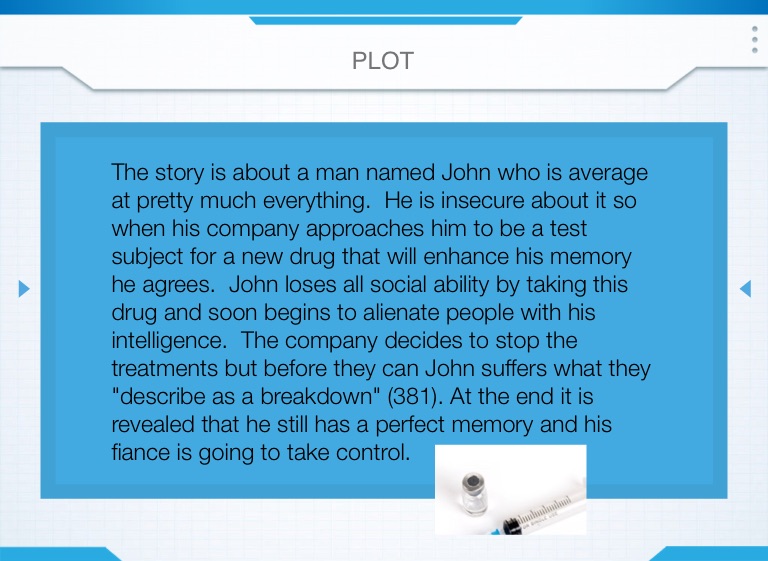 The story is about a man named John who is average at pretty much everything. He is insecure about it so when his company approaches him to be a test subject for a new drug that will enhance his memory he agrees. John loses all social ability by taking this drug and soon begins to alienate people with his intelligence. The company decides to stop the treatments but before they can John suffers what they "describe as a breakdown" (381). At the end it is revealed that he still has a perfect memory and his fiance is going to take control.