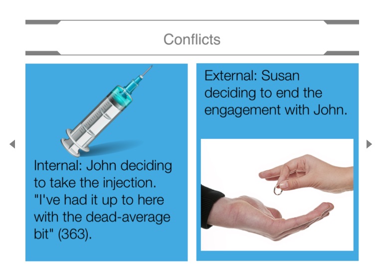 Internal: John deciding to take the injection. "I've had it up to here with the dead-average bit" (363).
