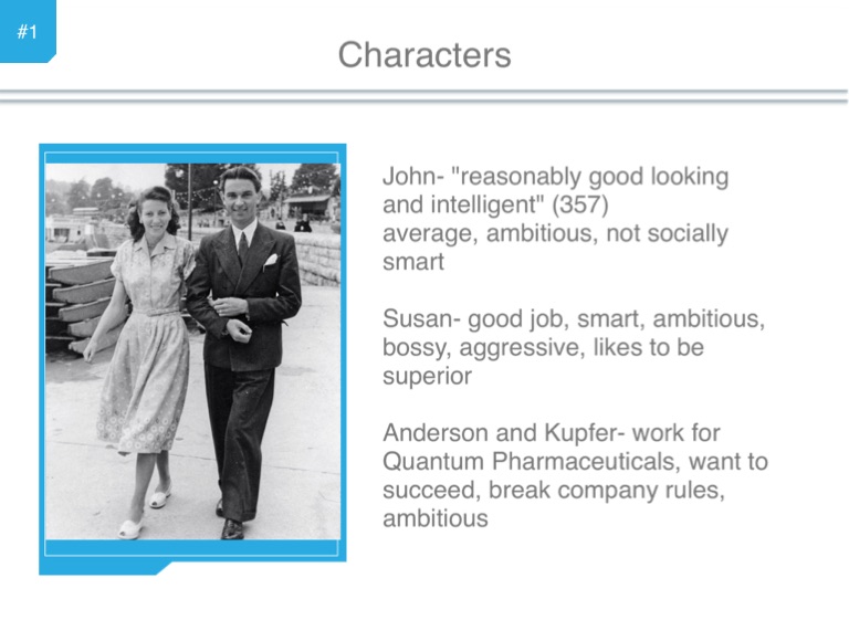 Anderson and Kupfer- work for Quantum Pharmaceuticals, want to succeed, break company rules, ambitious