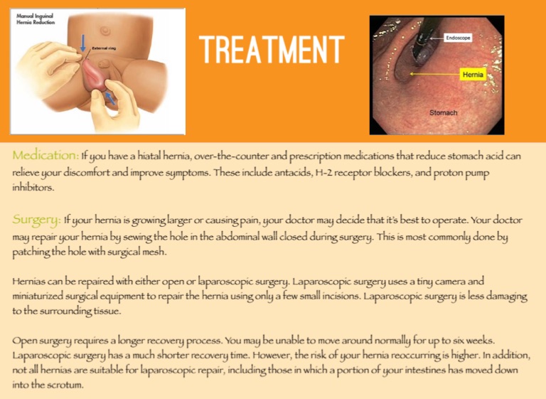 Medication: If you have a hiatal hernia, over-the-counter and prescription medications that reduce stomach acid can relieve your discomfort and improve symptoms. These include antacids, H-2 receptor blockers, and proton pump inhibitors.