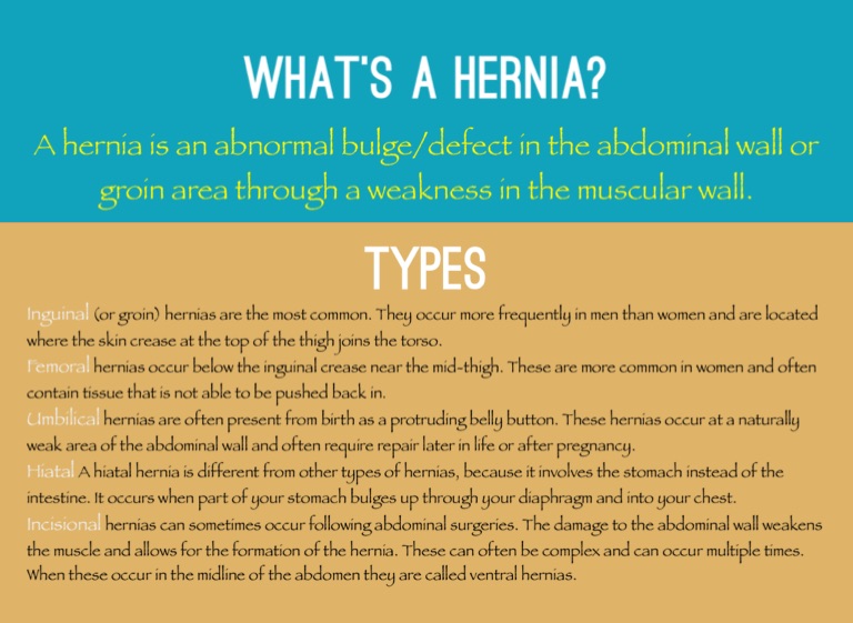 A hernia is an abnormal bulge/defect in the abdominal wall or groin area through a weakness in the muscular wall.